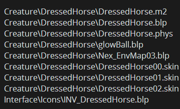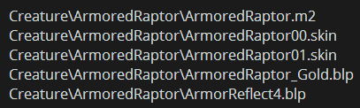 7.32补丁中有3个加密的生物,目前只有一些文件名数据被挖据出。首先被发现的是一只加密的装甲迅猛龙坐骑,挖掘出的文件数据名如下: