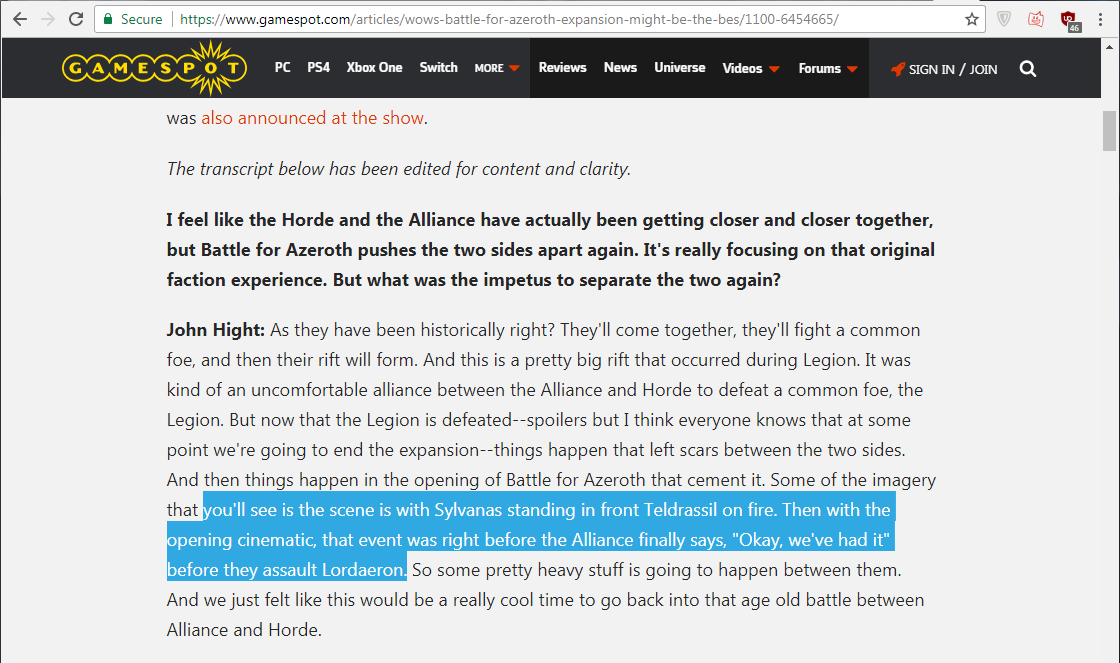 “你们会看到希尔瓦娜斯站在燃烧的泰达希尔前面的场景,然后是开场动画。正是在这个事件后,联盟最终说:‘好的,我们受够了’,然后攻打了洛丹伦。”