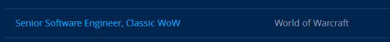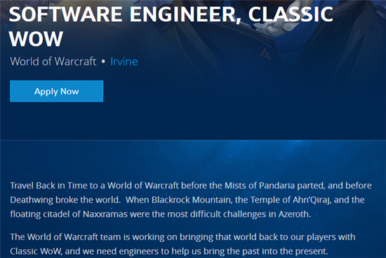 暴雪最近在招聘官网中加入了两个怀旧服的招聘信息,都是招聘软件工程师。招聘信息中写道:“时光重回潘达利亚之谜之前,回到死亡之翼破碎世界之前,那时候黑石山、安其拉神殿及纳克萨玛斯的浮空要塞就是艾泽拉斯面临的最困难挑战。魔兽团队正在致力于将经典旧世带回给玩家,我们需要软件工程师帮助我们将过去的世界重新带到现在。“