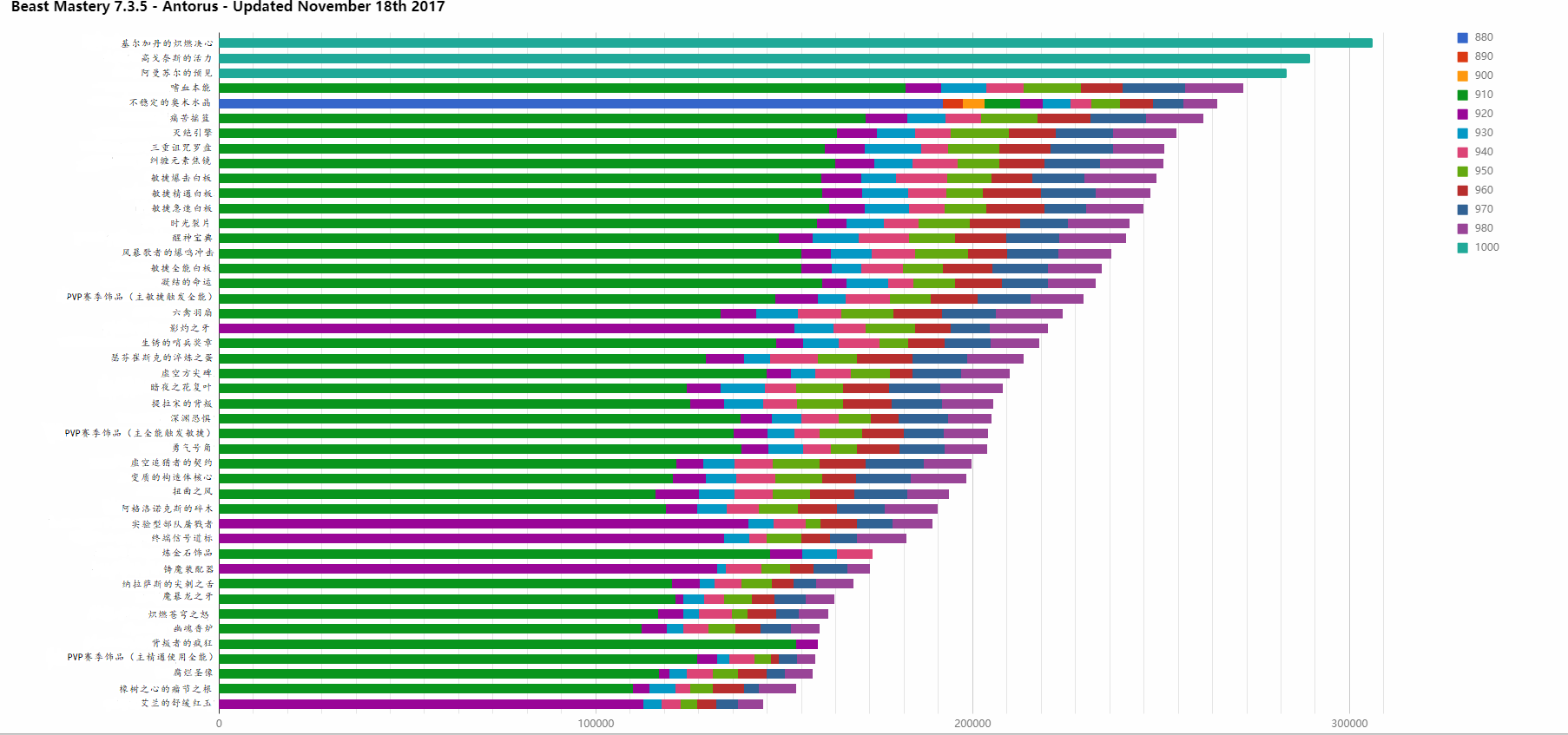 一点个人想法:兽王猎人比起1000水晶,似乎更需要高戈奈斯的活力,或者嗜血本能,双水晶的配装是绝对不可取的,一般来说,7.35兽王应该为高戈奈斯活力+910+水晶,或者本能+水晶。射击猎不出所料,水晶类饰品依旧登顶,但哨兵奖章饰品单体表现抢眼,7.35射击应该是水晶+哨兵的配装,凝结命运依旧强力,但要依据战斗时间轴选用。生存的局势应该是需要敏捷与副属性全面发展,所以,很多饰品差距都不大,但依旧推荐命运+本能的配装。