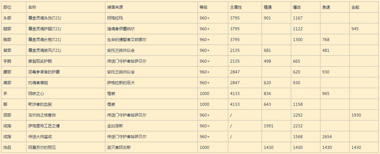 各位皮卡丘们好,即将开始新的团本,整理了一下Bis掉落列表(暴击>精通=急速,全能随缘)