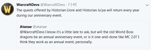 周年活动还会有旧世界BOSS事件 2017-12-01 16:30 新浪游戏 0 Q:13周年的旧世界BOSS是和十周年的MC那样一次性的活动,今后不能再打了,还是每年都可以打? A :魔兽历史问答任务以及“原汁原味”任务和相关的世界BOSS每年周年纪念活动时都会回来的。 译者:装甲魔暴龙乌达斯塔