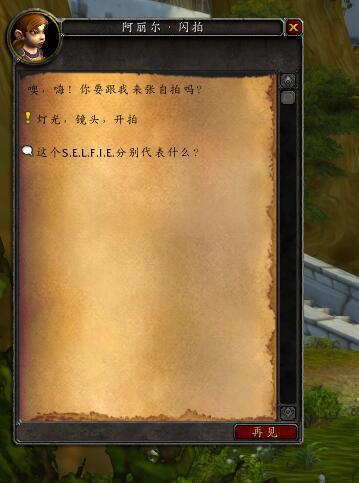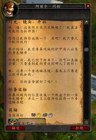 而对于从没拥有过自拍神器的玩家,她会提供一个名为“灯光,镜头,开拍!”的任务,任务直接奖励自拍神器玩具,要求收集暴风城周围的几个物品。