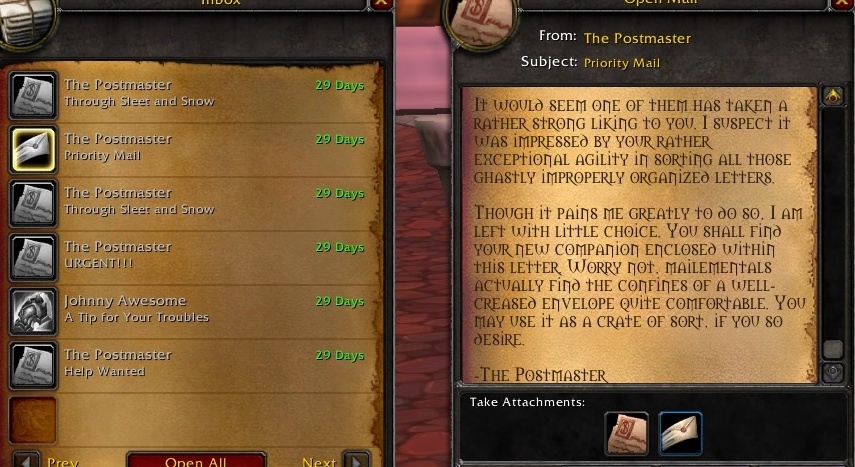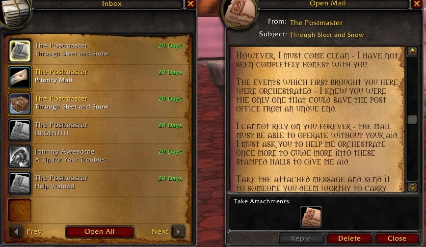 任务的开始你将把这封遗失的邮件投递给达拉然下水道的郭雅夫人,而信的内容则更搞笑了,你们都知道郭雅夫人是黑市老板娘,而这封信,则是某个土豪玩家在黑市买战士T3套的货款(玩梗还是官方6)。完成任务后,你会在邮箱中收到一封神秘来信,信件的署名是“邮政长”,说他最近忙的不可开交,介于你在这封遗失的邮件的完美的处理上,他很欣赏你,需要你帮他做事情,你就可以得以传送到神秘的“邮政长房间”。