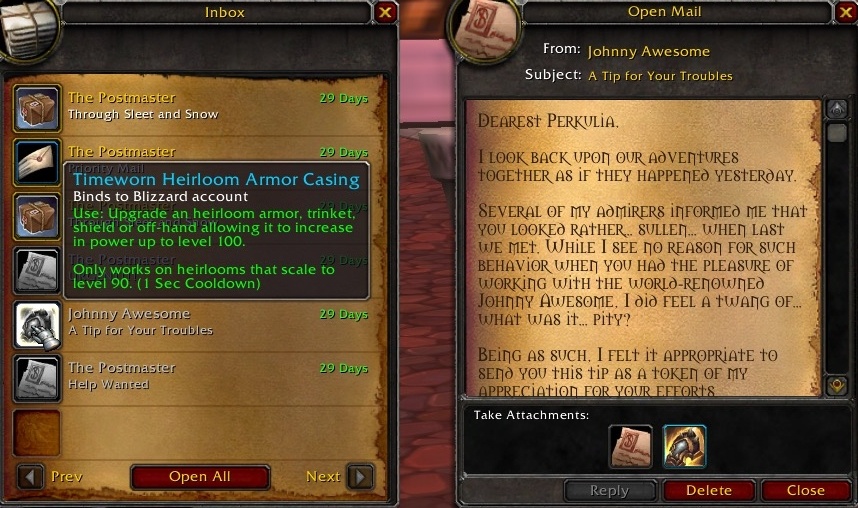 任务的起始,会在达拉然的任何邮箱附近刷新一个“遗失的信件”的任务道具,拾取后使用可以开启任务。注意任务道具是“使用后绑定”的,而且该信件在你完成了所有的任务链之后会再邮寄还你一份,所以完成后你怎么处置这玩意就看你自己咯~
