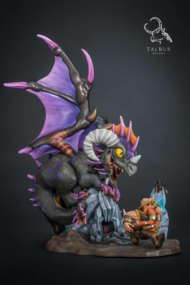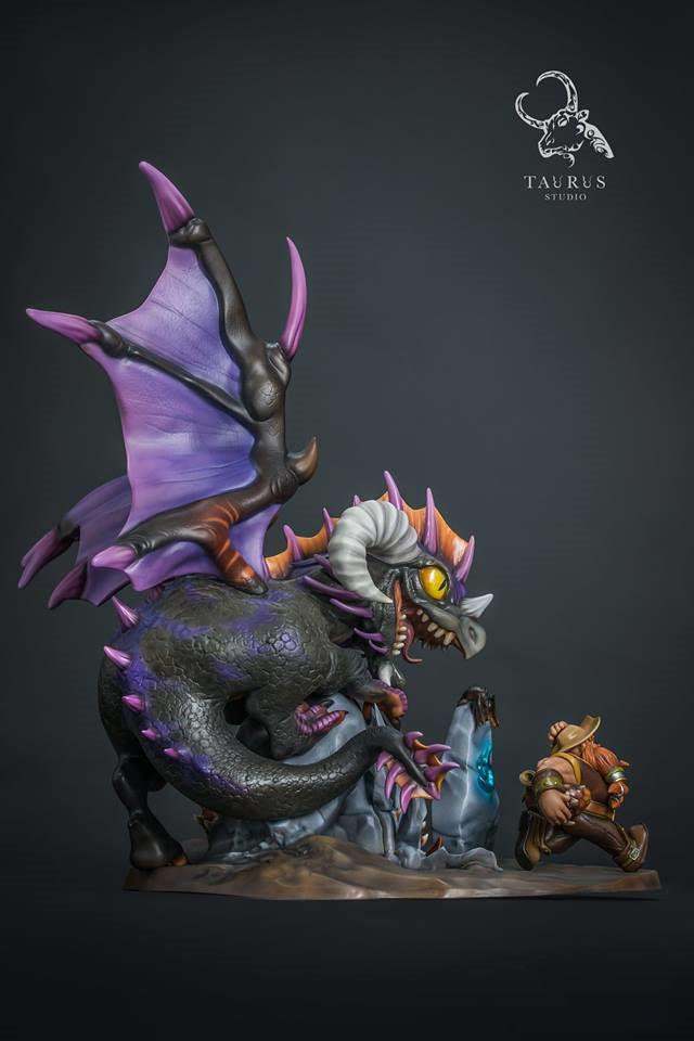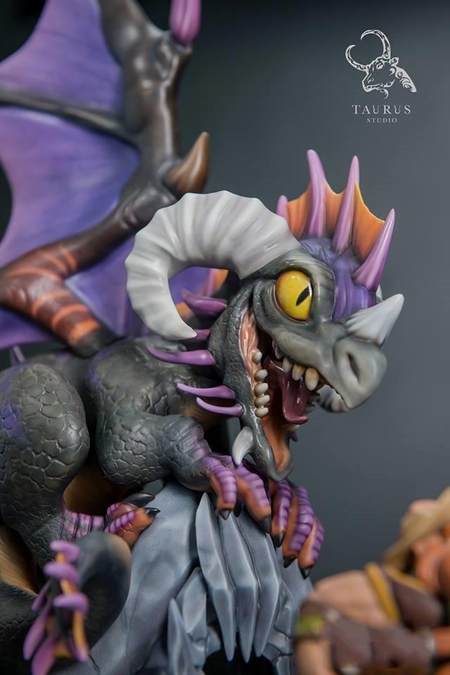 这组手办雕像,矮人落荒而逃的神情体态捕捉德非常到位,其后的奥妮克希亚模型也非常协调,似乎龙息即将喷薄而出。雕像也有一些细节设计,比如地上的黑龙蛋以及那一只趴在集合石上的小黑龙。