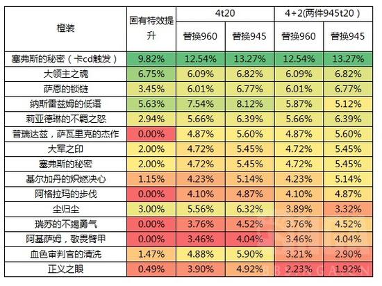 除了部分欧洲王中王可能会有高装等的4t20+2t21之外,大部分人能有两件945的t20就已经很不错了,因此在考虑套装使用时估算只用4t21和2t20+4t21两种情况。2t20带来的特效占比约为18%-18%/1.2=3%,而在用头、肩、胸、披风部位的橙时则无法带来4+2特效,也就是会少3%dps。而在全身960的条件下,仍用两件945也会带来dps负影响,考虑到萨墓boss的难易以及尽量使用t20小件,这里在960条件下默认两件t20为手和披风,这会因为绿字降低带来的dps影响约为1.33%。这里不考虑其他低装等t20带来的dps负影响,如有兴趣的可以自行按照500绿字=1%dps测算。