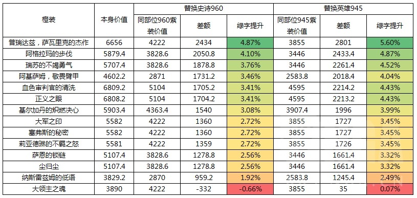 讨论橙装的优先级,不能将其与整体装备割裂开来单独计算。因为橙装的价值并不是指这件橙装本身能提供多少dps,而是指这件橙装替换掉你身上原有的紫装后的dps提升。这里就涉及到了橙装固有属性相对紫装固有属性的提升,这里所替换的紫装统一按照英雄945和史诗960两个等级做对比,对于其他装等紫装的替换则需自行估算。