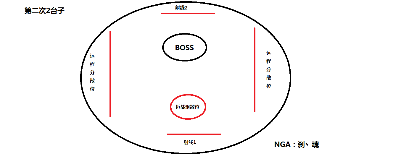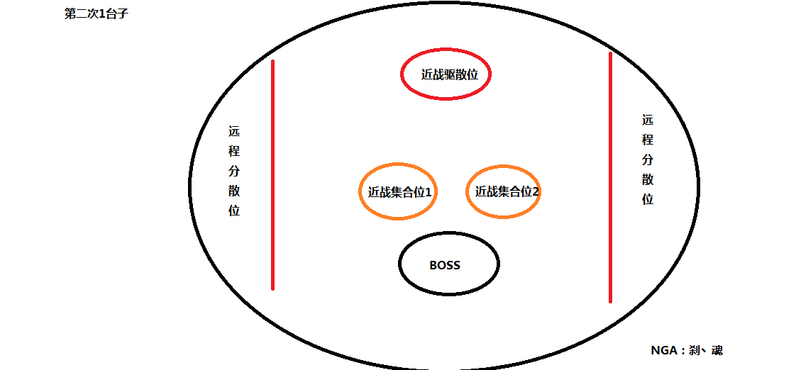 从1台子过来后肯定会有强化手雷DEBUFF没有结束的,这些人只要出去分散等待DEBUFF结束即可。其他人则可以去集合位1等红色地雷丢出来去集合位2,这个时候坦克换嘲结束,副T去清理红色的手雷。在这个阶段我选择了把所有压力都给了坦克,而其他人需要做的就是无脑打BOSS完全不需要考虑地雷,如果意外误踩了也没事,这个阶段人群都是相对集中的对于铺地毯的治疗来说是绝对舒服的。