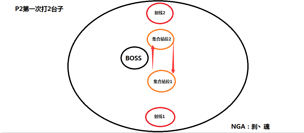 这个boss与H模式差别在与团队要跑4次过桥,其中1台子过桥到2台子是压力最大的因为会有坦克的AOE与强化手雷人员的压力。每个团队配置不同打法也会不同。我采取了一个相对来说对团队要求最低的跑位法,这里以画图的形式来表达。