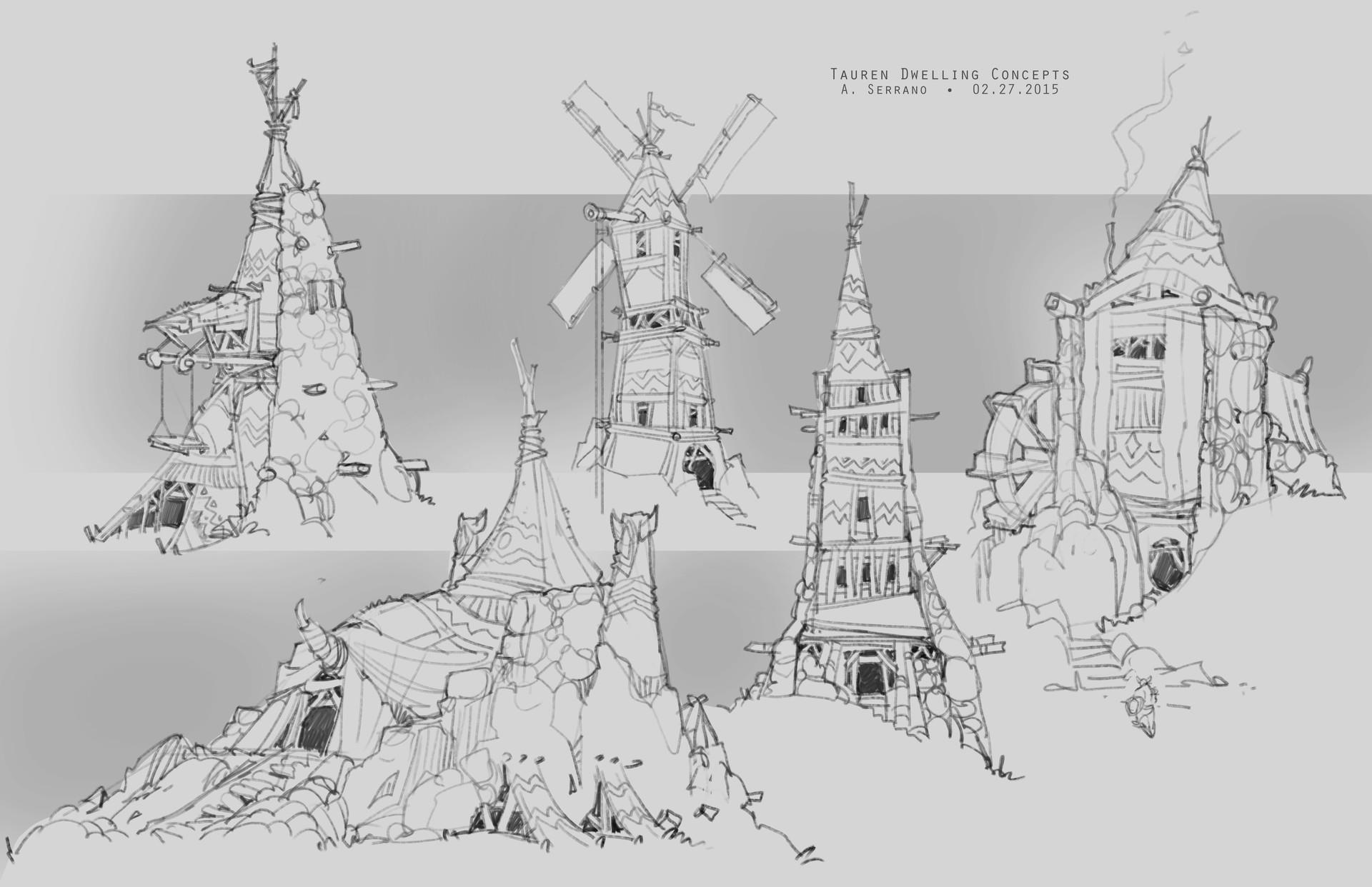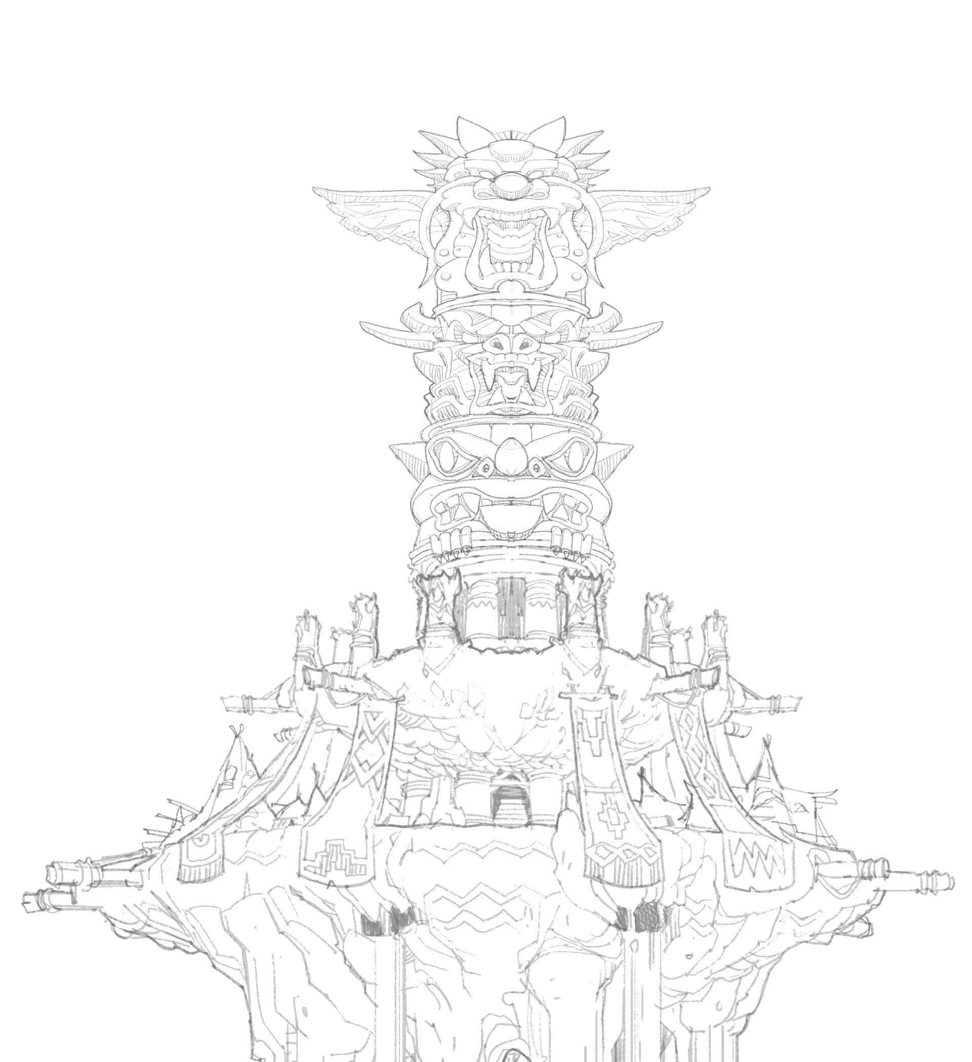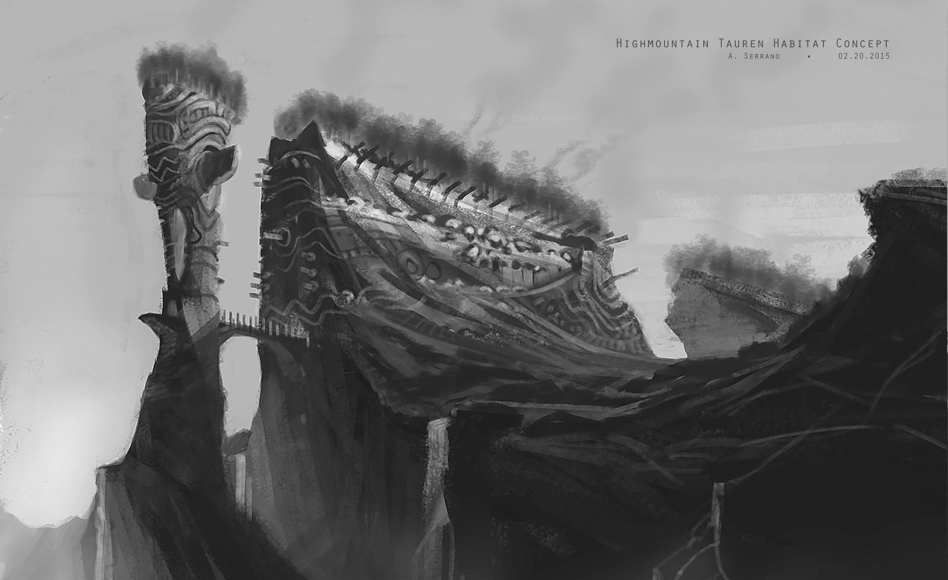 Armand的至高岭视觉设计图与现在游戏中的至高岭在风格上完全不同,更具有浓郁神秘的萨满教气息和仪式氛围。在他的设计中,至高岭主城大部分区域都是一个巨大的图腾外观,整个图腾是一个神庙建筑,下半部分则是牛头人的居所和大厅。