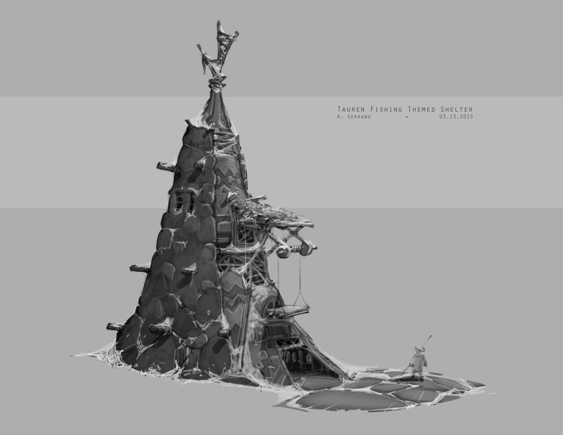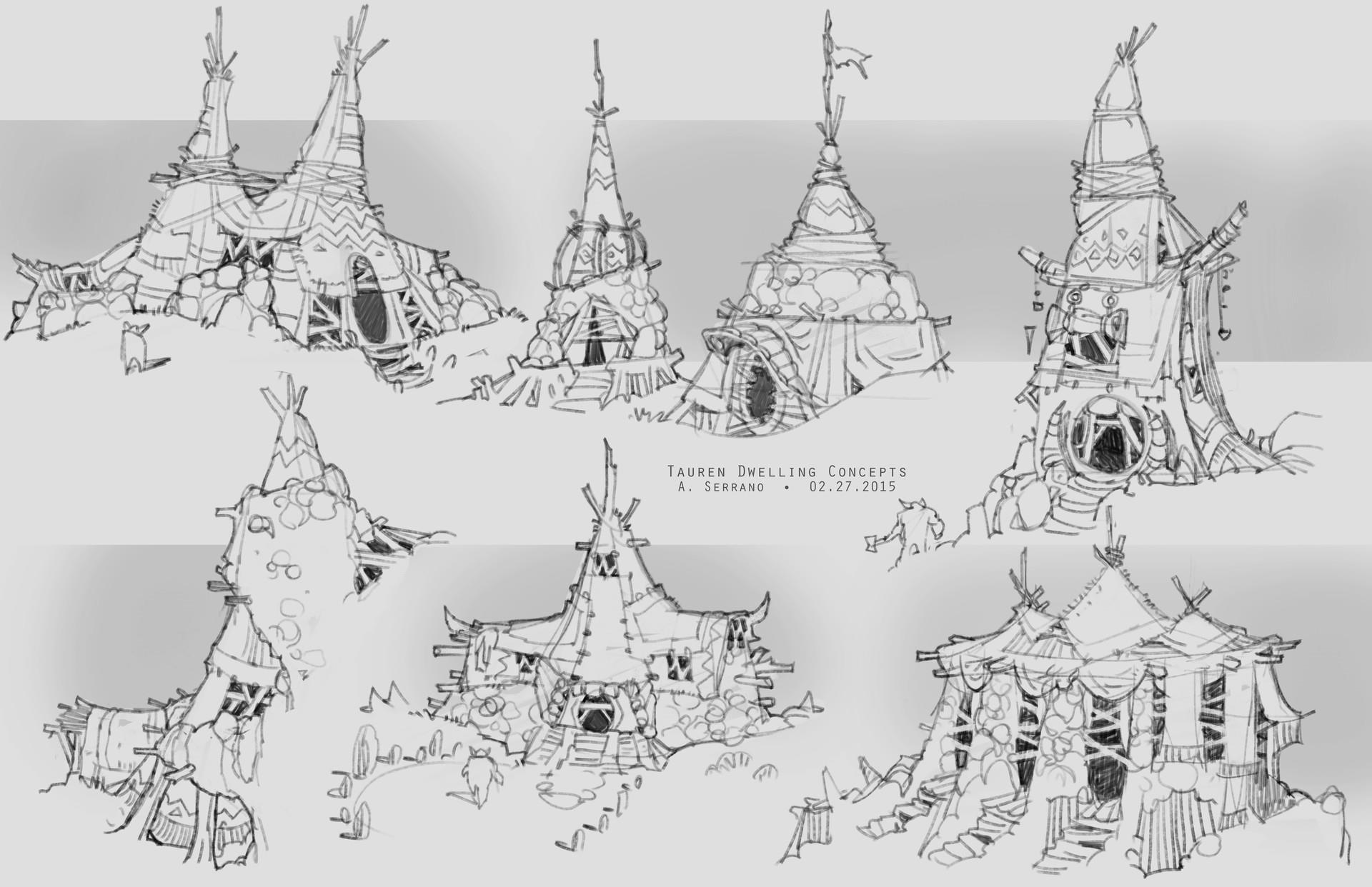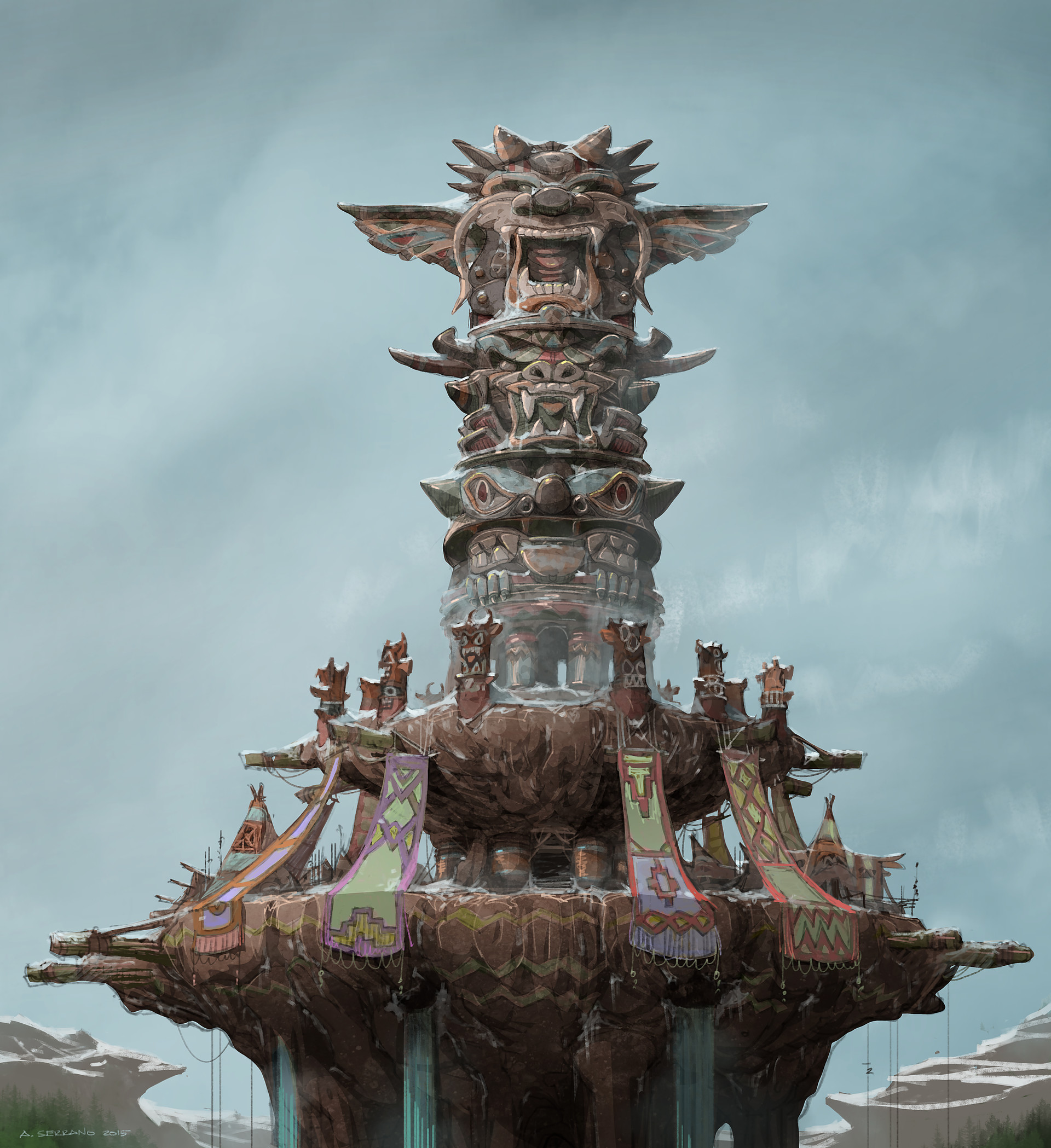 Armand的至高岭视觉设计图与现在游戏中的至高岭在风格上完全不同,更具有浓郁神秘的萨满教气息和仪式氛围。在他的设计中,至高岭主城大部分区域都是一个巨大的图腾外观,整个图腾是一个神庙建筑,下半部分则是牛头人的居所和大厅。