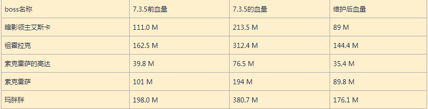 7.3.5上线后玩家发现旧团本boss的生命值比补丁前有了显著提升。今天维护后boss的血量已经下降,德拉诺之王版本的boss生命值事实上变得比上个版本还要少了。然而潘达利亚的团本boss仍比上个版本要多。