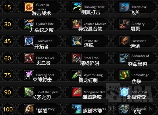 猛禽一击:凶狠的猛击,造成 257 130%点物理伤害。消耗集中值从25上调到30,范围从5码改为近战范围。