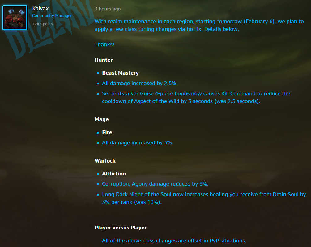 - 巨蛇追猎者的伪装4件套装奖励现在使杀戮命令缩短野性守护3秒冷却时间(原为2.5秒)。