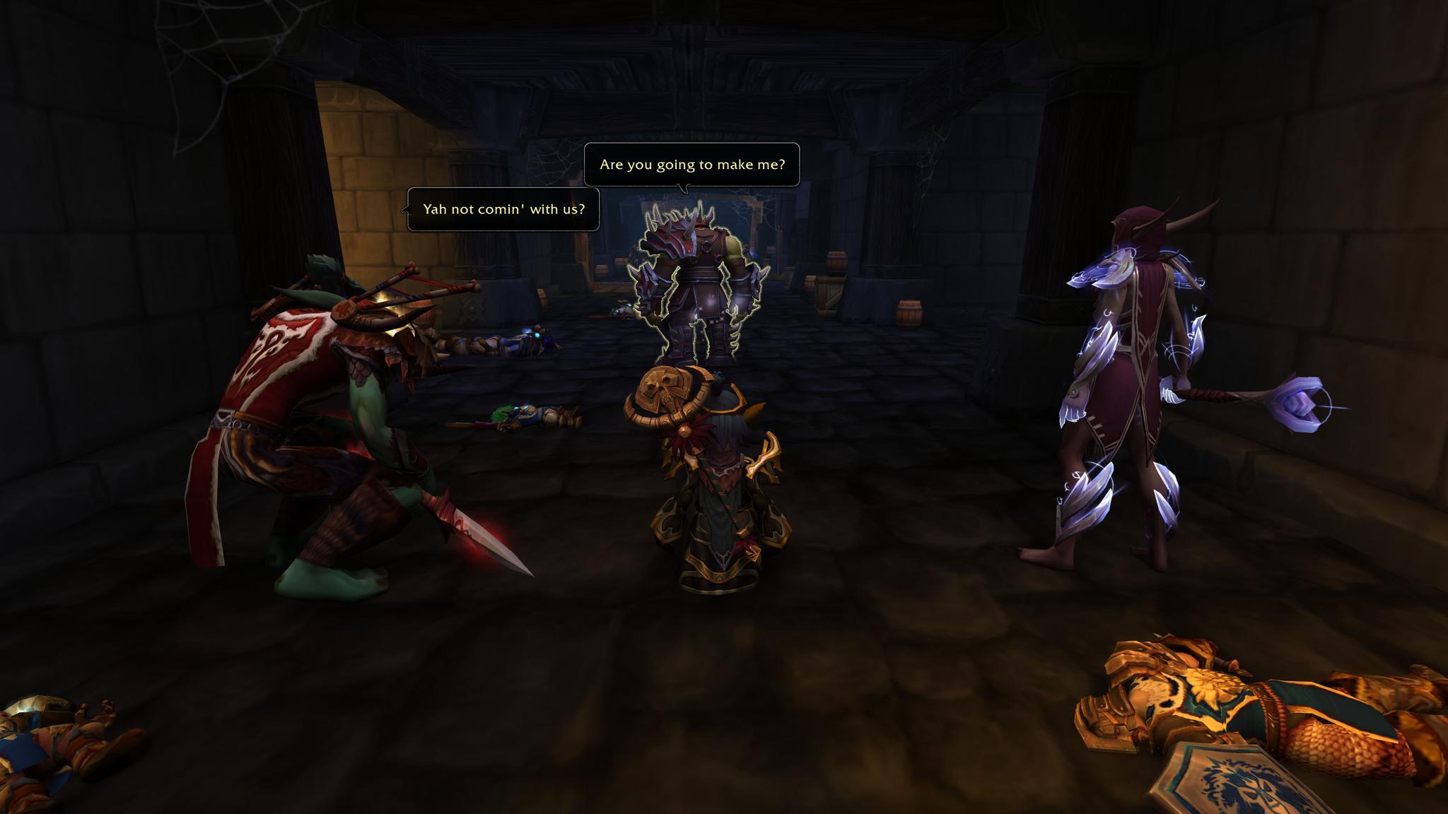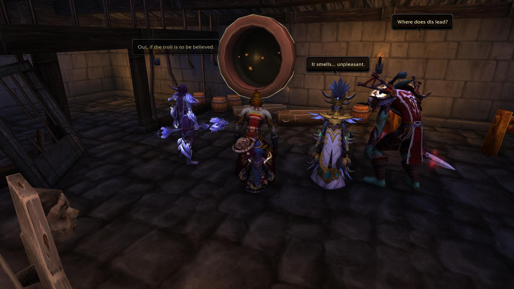 在萨鲁法尔所指示的牢房中,你找到了两名巨魔。其中一名是有着华贵的赞达拉装束的女性,另一名,却是老熟人了,他席地坐着,也不管牢房邋遢,但你认得出他。你们在潘达利亚和荆棘谷遇见过——