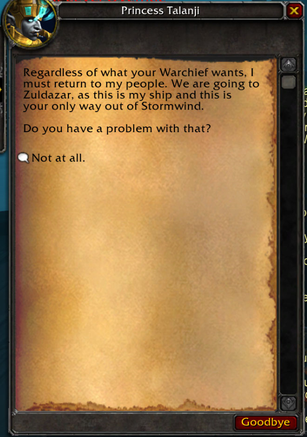 不论你的大酋长有什么打算,我必须立刻回到我的同胞身边。我们现在就前往祖达萨。毕竟这是我的船,你也没别的办法逃离暴风城。