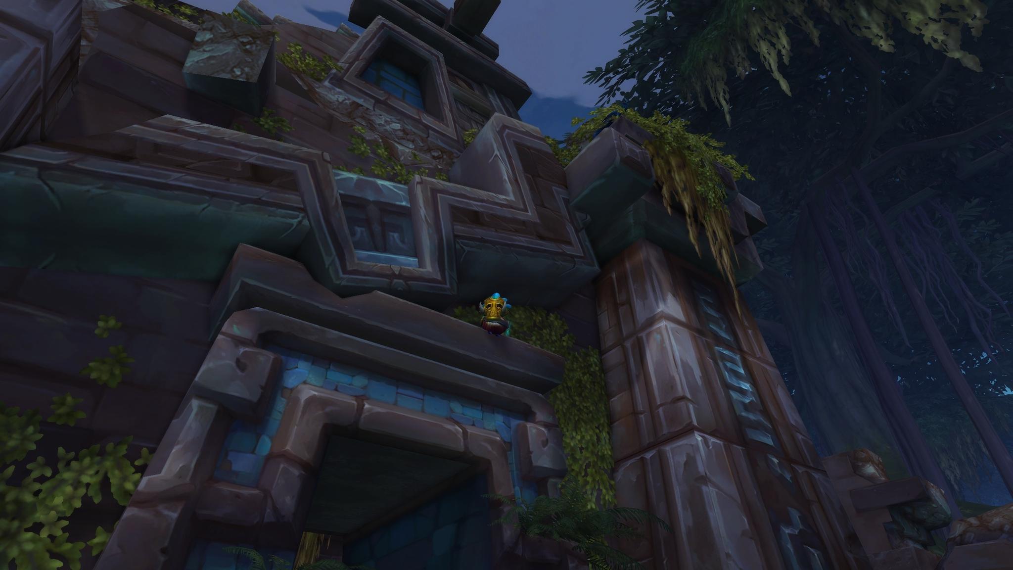 在纳兹米尔的佐巴尔废墟的“旅馆”上面,佩佩戴着赞达拉面具,凝视着血月。