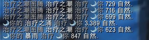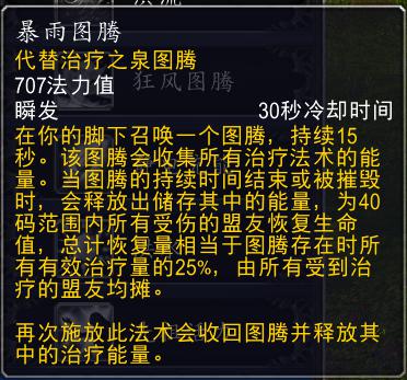 暴雨图腾可吸收的技能(有效治疗部分)有:激流的初始治疗和之后的每一跳,治疗之涌,治疗波,治疗链的每一跳,治疗之雨的每一跳,升腾,奔流之涌