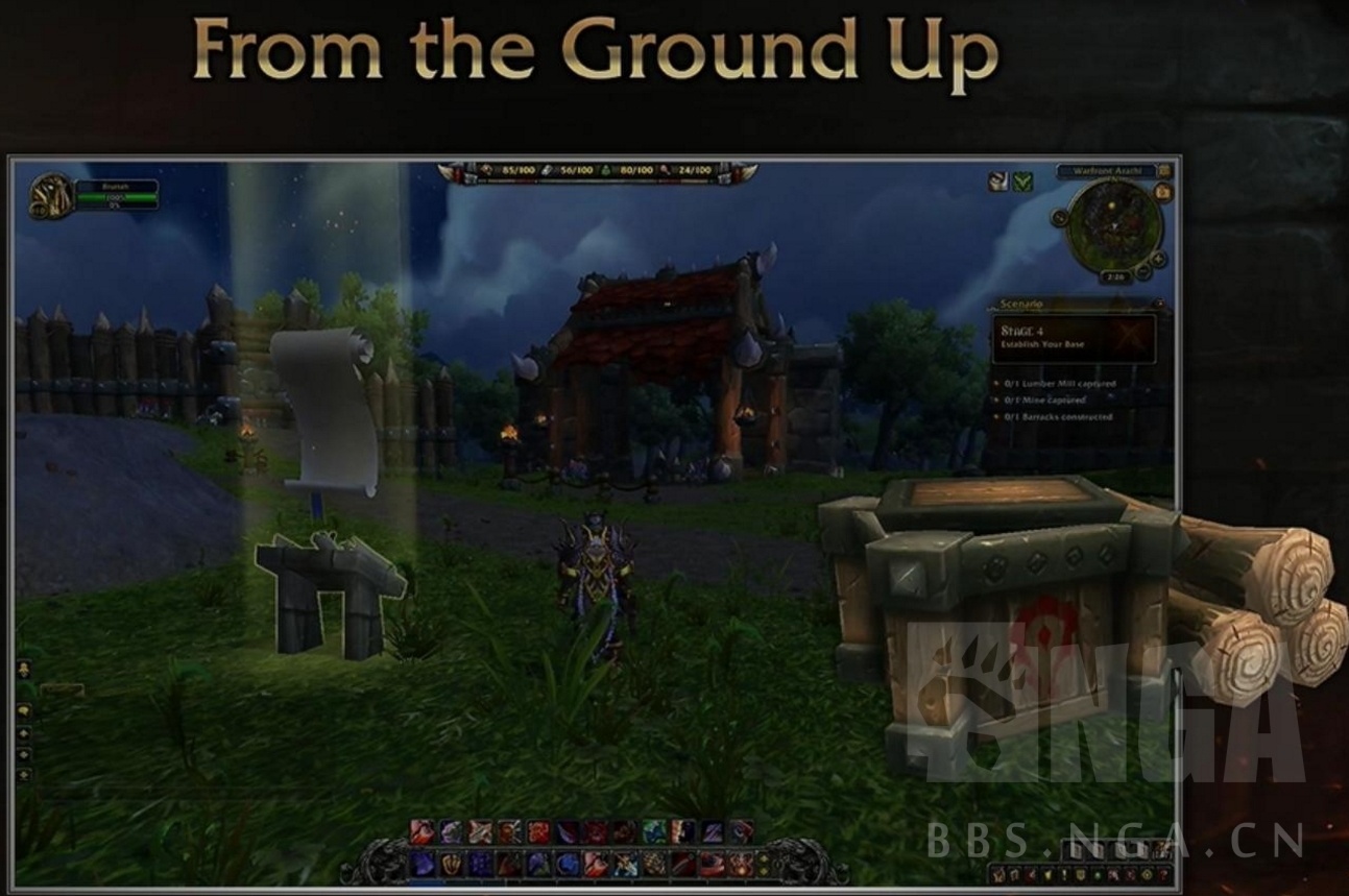 并且在地图显示了部落方玩家的各种资源点。嘉年华展示的动画也是部落方在建造,爆兵之后进攻激流堡的片段。