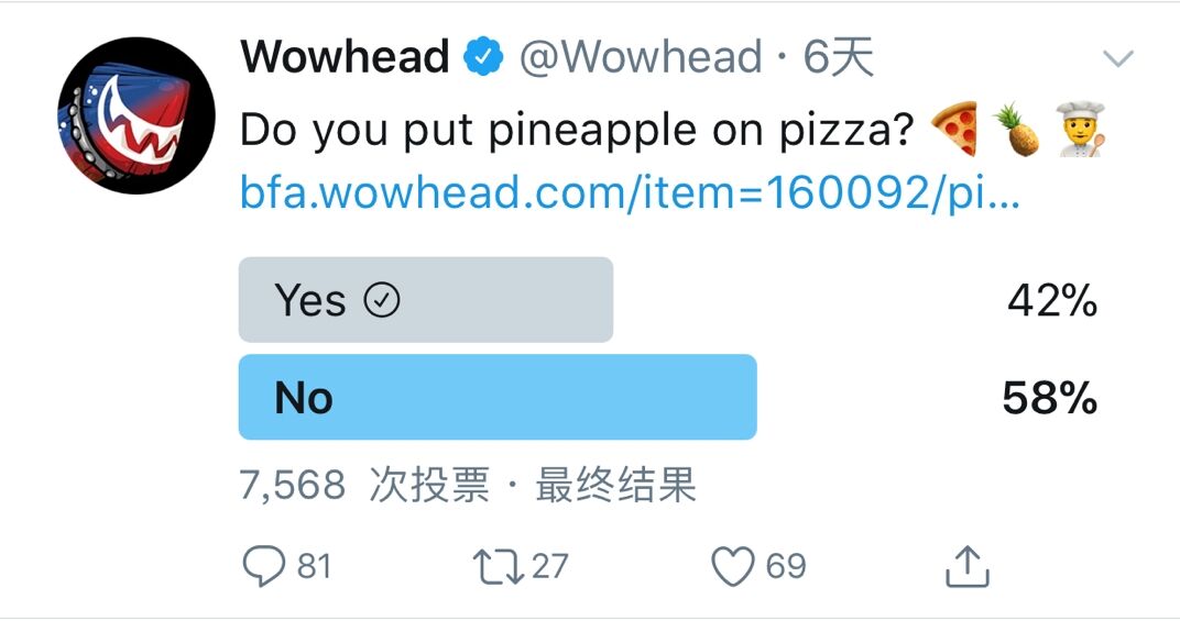 Wowhead官推也发起了一个投票,”你往披萨里加菠萝吗?“ 7568次投票的结果是:百分之42选择加,百分之58选择了不加。
