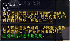 (2)牺牲光环:常态减伤为19×0.1×100×0.5=95,需要生命值保持在95×4+100=480以上。掌握减伤为6×19×0.3×100×0.75=2565。需要生命值在2565/6+100=527.5以上。进一步推导生命值阈值:设受到DPS=a,则常态需求生命值保持在4.8a以上以触发牺牲光环转移伤害的效果,光环掌握期间需要保持生命值在5.275a以上以确保存活。实际使用中,常态减伤会受10码内盟友数量的多少影响,1个盟友提供5的减伤。实际使用中,掌握减伤可以被圣佑术/圣盾术减免。在这种情况下,使用圣佑术时多减少2565÷3×0.2=171点伤害,使用圣盾术时多减少2565÷3=855点伤害。