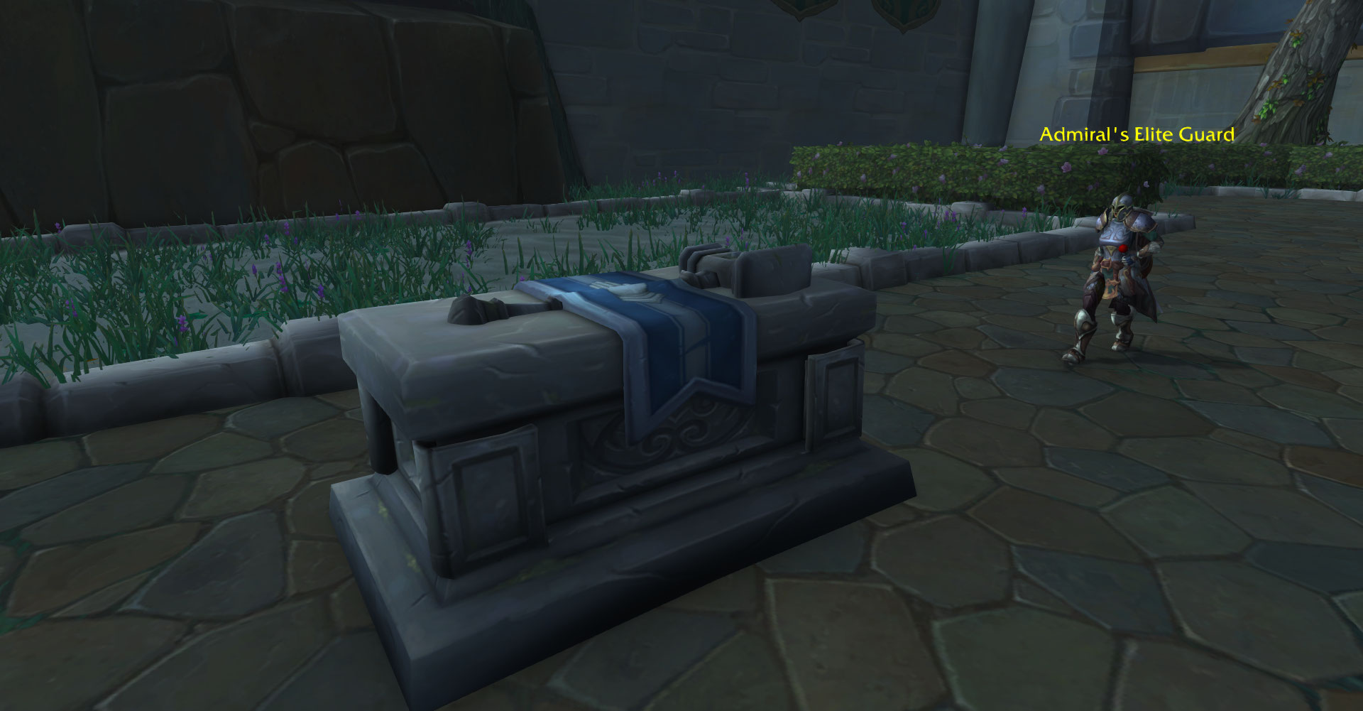 而这是一个覆盖着白银之手旗帜的坟墓,位于普罗德摩尔要塞一侧,有卫兵来回走动巡逻保护。历次build均没有改动这个旗帜图案。
