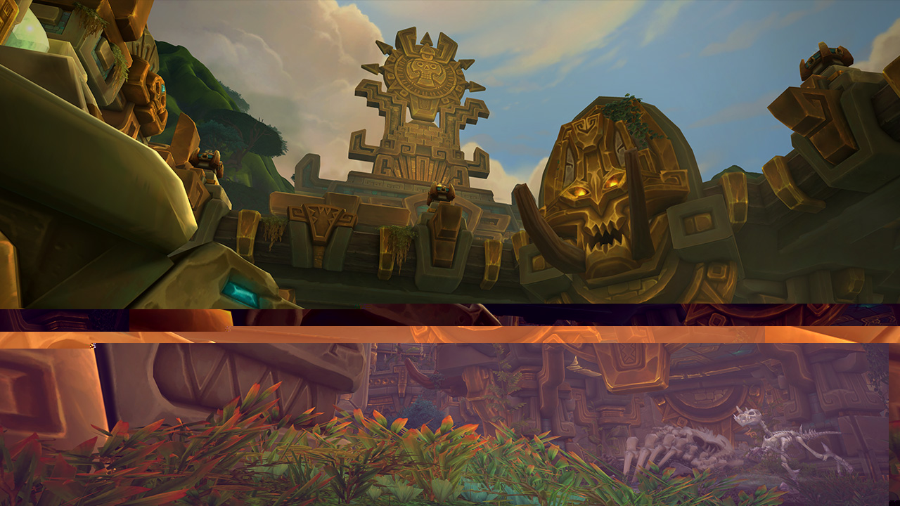 黄金王座坐落在在丛林的树冠带之上,那是祖达萨城市的中心,你能从那里看到这片区域中最摄人心魄的美景。在王座上,拉斯塔哈大王统治着赞达拉。一座古老的城市在下方连绵延伸,四通八达的平台通向供奉神灵的庙宇,神灵的忠仆们则维护着这些区域。