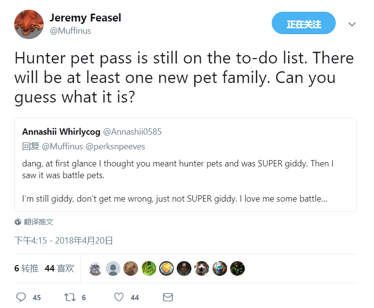 他说:“猎人宠物通行证仍在待办事项列表中。至少会有一个新的宠物种类。你们能猜到是什么吗?”