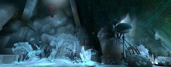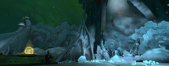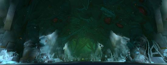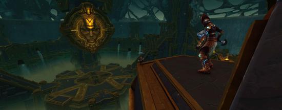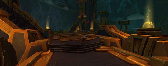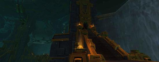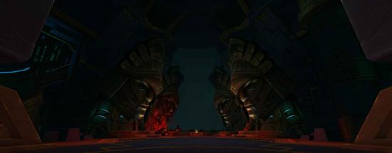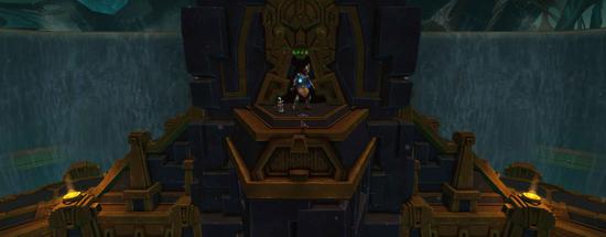 这是一个建在地底的建筑群,四周由瀑布环绕,整栋建筑继承了赞达拉的建筑风格,以金绿色调为主,到处充满了粗狂的回纹纹饰线条和轴线布局。