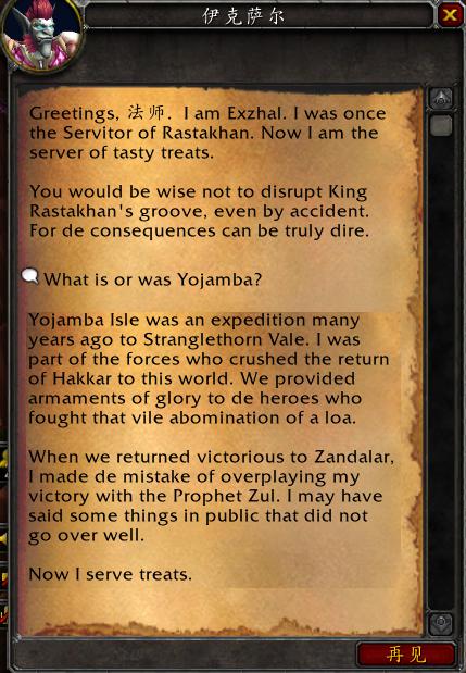 该NPC提及德鲁伊与萨满两个职业,经测试后发现,这两个职业的对话并无变化,而85年代的祖尔格拉布也并不会有额外掉落,日后或有变动。