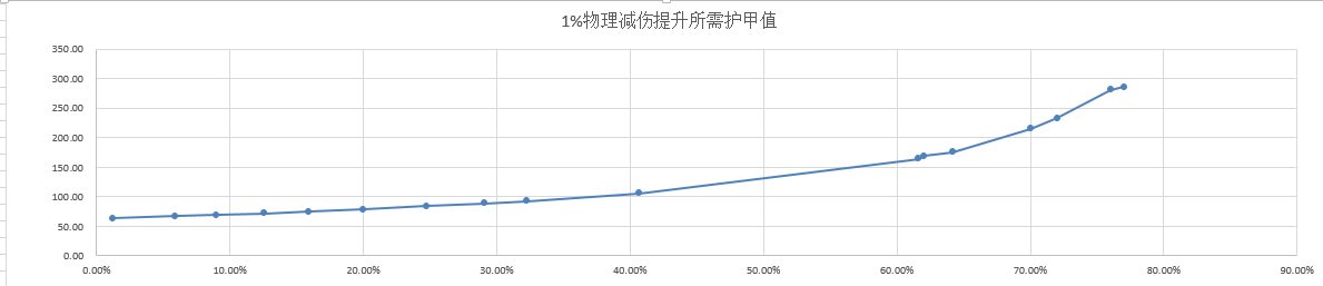 可以看出,在物理免伤达到70%以后,基本趋于平稳,而此时,再提升1%所需的护甲值非常高