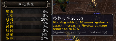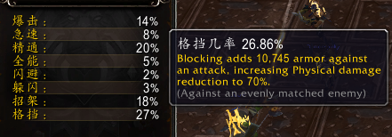 格挡值为BFA版本中的实际效果为如下 格挡一次攻击时增加x点护甲值,减少所受物理伤害的y% (对抗与你实力相当的对手时)