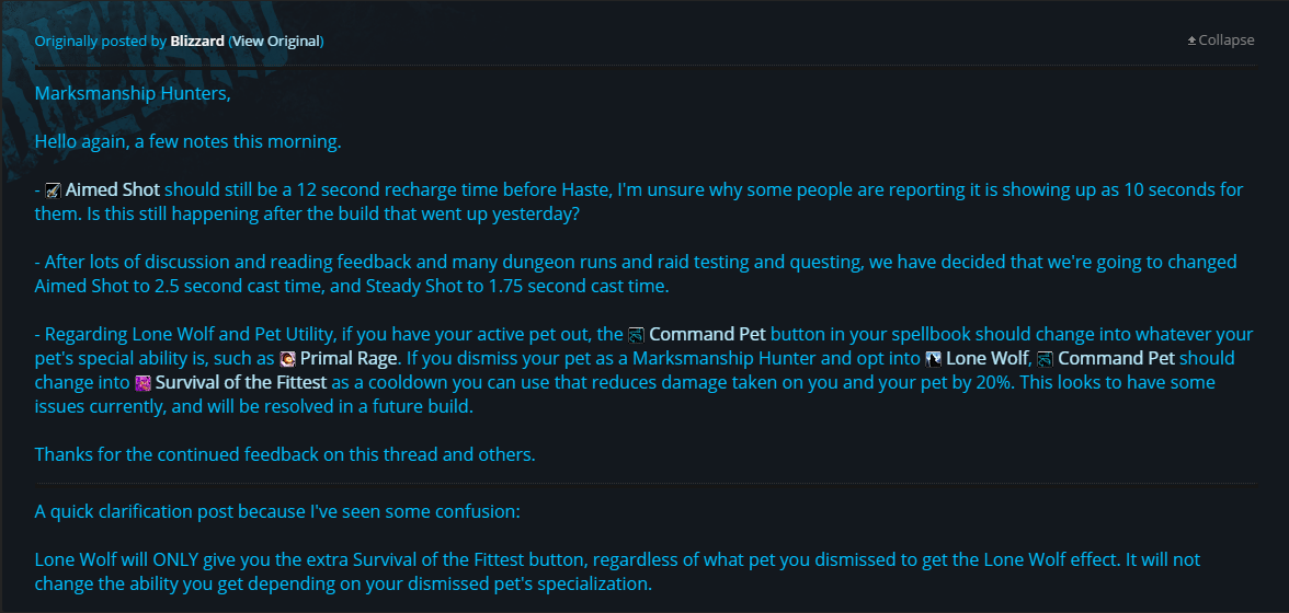 通过大量的讨论、读取反馈及许多地下城和团本测试后,我们决定将瞄准射击施法时间改为2.5秒,稳固射击施法时间改为1.75秒。