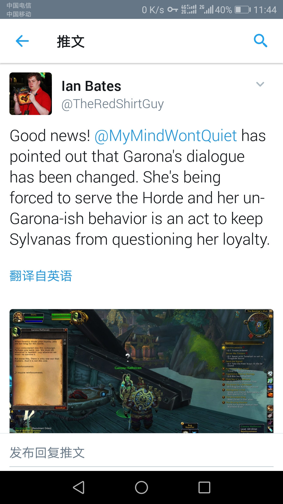 迦罗娜加入战争对话发生改变 2018-06-25 13:19 新浪游戏 0 国外魔兽圈著名的红衣小子近日在推特上又放出了消息,测试服中有关于迦罗娜的对话已经做出了改变。 从如今迦罗娜在测试服里的对话,我们可以看出,迦罗娜加入8.0的战争貌似并非出于自愿。 作者:啧额啧额