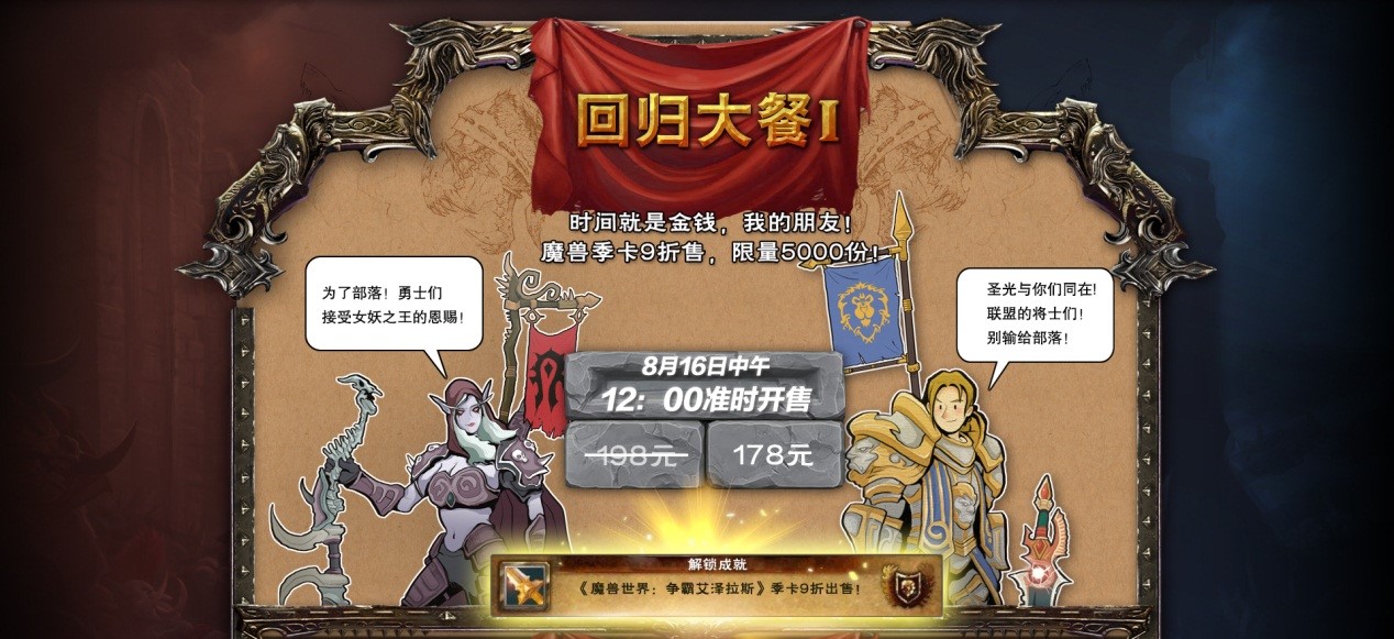 8月16日-8月18日,原价198元的魔兽季卡以178元的价格九折出售,限量5000套,先到先得。