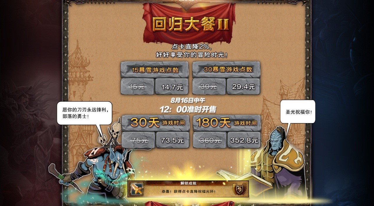 8月16日-8月18日,战网点卡、魔兽世界月卡、魔兽世界半年卡优惠2%;各位玩家可以尽情享受冒险时光。