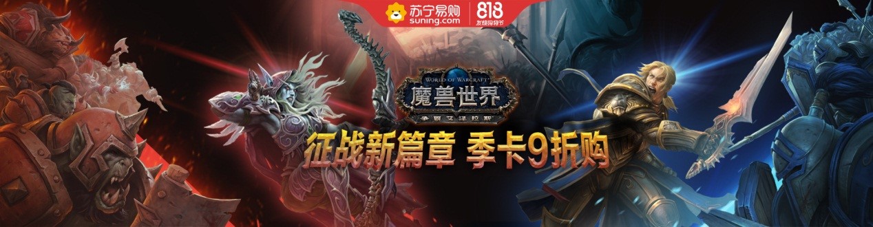 《魔兽世界8.0:争霸艾泽拉斯》已于8月14日全球同步上线,苏宁电脑818购物节“季卡9折购”的优惠活动现已开启,8月16日-8月18日苏宁易购为魔兽玩家准备了3份回归大餐,千万不要错过!
