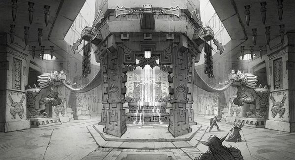 最后一张图被命名为“祖达萨概念图”(Zuldazar ConceptArt),这是一件很有意思的事情,因为在画面的前景里出现了一些人物,看上去像是在进攻。辨认这些人物并不容易,但看上去像是一个暗夜精灵,一个人类和一个矮人——或许这是描写在未来发生的一场入侵?