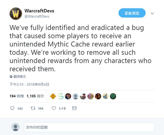 暴雪很快发现了这一bug,立即禁用了大秘境低保箱,使得后续闻讯赶来的玩家无法再打开。现在,暴雪发布官方推文,说明该bug已经修复,而那些从bug中获得的奖励将会被移除。这些奖励包括具有非常高的物品等级的泰坦造物装备,以及极高层数的大秘境钥石。