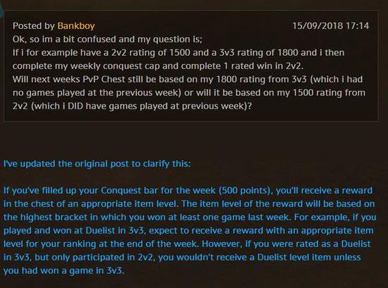 《争霸艾泽拉斯》PVP第一赛季已经开放两周多了,随着暴雪不断修复PVP周常任务的bug玩家的体验也在逐渐变好。但是,玩家对PVP周常任务依然会存在一些疑问。欧服玩家Bankboy向暴雪询问PVP周常箱子奖励的具体计算方式,而暴雪的社区经理通过蓝贴回复了这位玩家的疑问,确认了周常箱子的奖励将根据玩家上一周已进行的战斗的最高分来计算。
