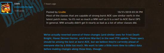 我们实际上已经在下一版的PTR补丁中取消了这类针对爆发性AoE(如冰DK、浩劫DH、武器战)的改动。这些专精应当能身处最擅长爆发AoE的行列,但我们认为它们目前的表现与其他专精相比超出太多了。在我们对这方面进行正式的改动前,还需要一些时间去收集更多的数据。