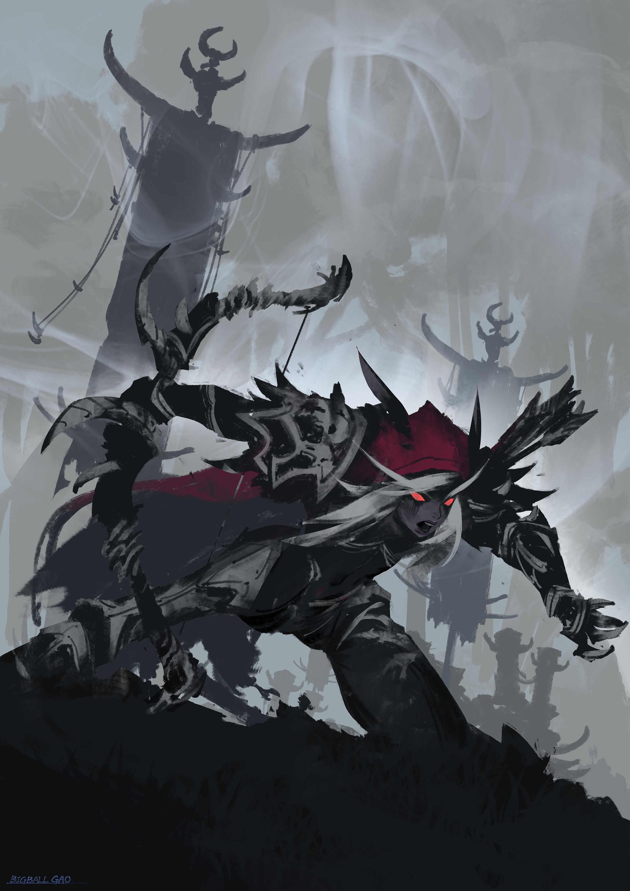 2。从构图和景深关系的角度来看,中景女王是最关键的设计,所有的细节信息都会优先作用在她的身上,周边信息均为女王服务,然后用几个固有色去概括一些细节,例如铠甲(金属),兜帽斗篷(布料),头发,眼睛,牙齿等这些明信息,顺便还能在心里区分好质感。