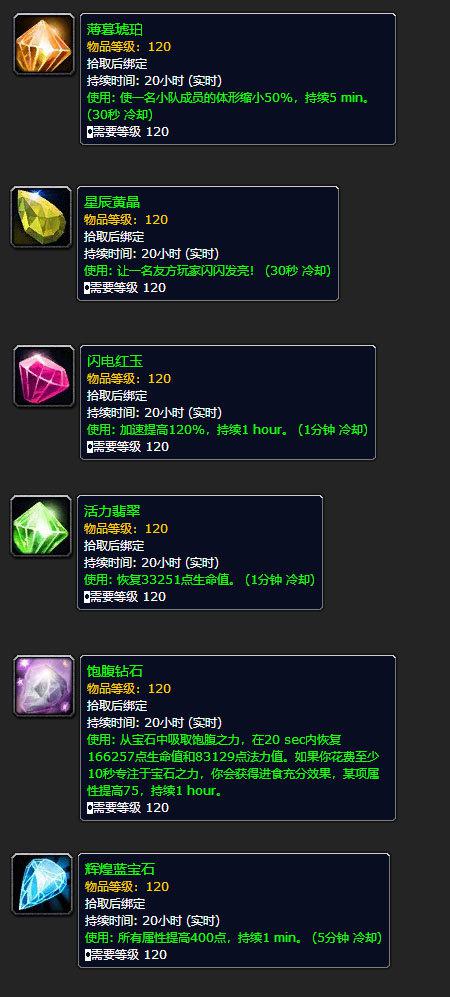 [辉煌蓝宝石]所有属性提高400点,持续1分钟,5分钟冷却。和战斗药水共享1分钟CD。