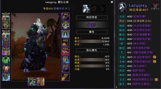 另外需要注意的是,碎片换的415特质装对恶魔术来说是垃圾,你只需要想办法拿 毛 到H老1衣服,H老3头,H老7肩膀,凑够3爆破+2狡诈+1怨毒就可以在团本里呼风唤雨了