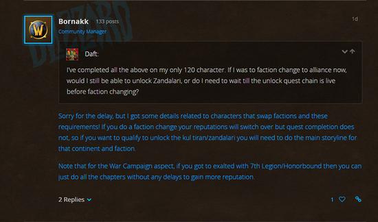 近日,有玩家在官网论坛发帖询问转阵营解锁同盟种族的问题。在昨天的赞达拉巨魔与库尔提拉斯人类官方介绍视频公布后,官方对这个问题进行了回应,并确认了转阵营后解锁同盟种族的条件。