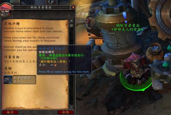 麦卡贡的访客日常任务,刷新到郭雅夫人密探时,会给予一个奖励远程访问黑市拍卖行物品的任务。任务完成方式也非常简单,需要去纳沙塔尔的营地找几个鱼人商人兑换5个[奇特的鱼人之角]即可。