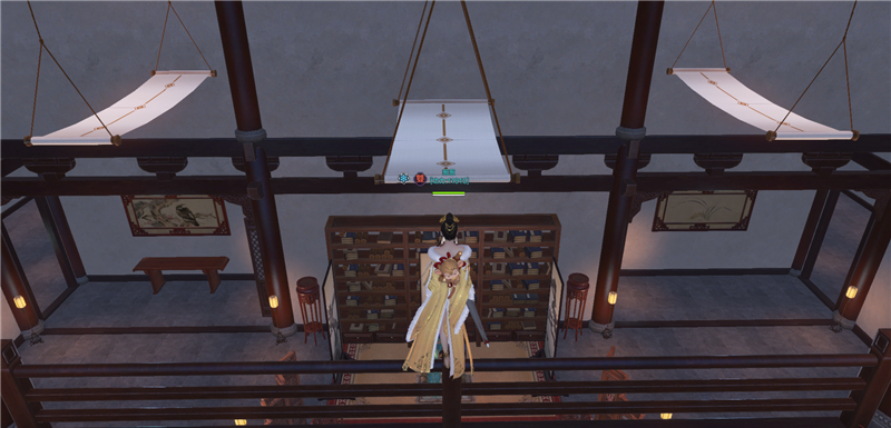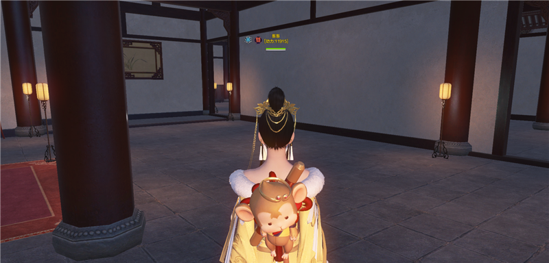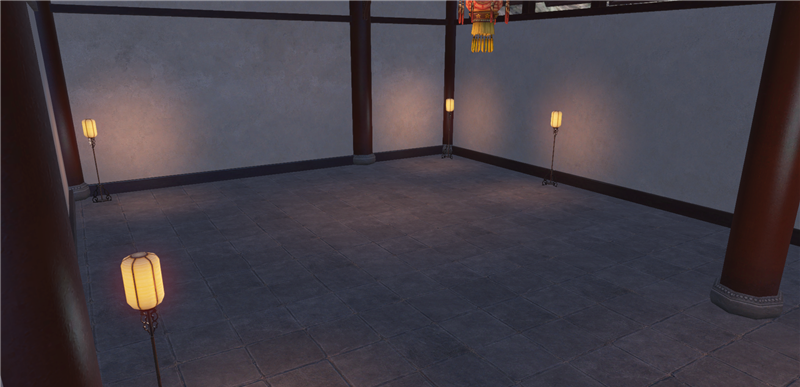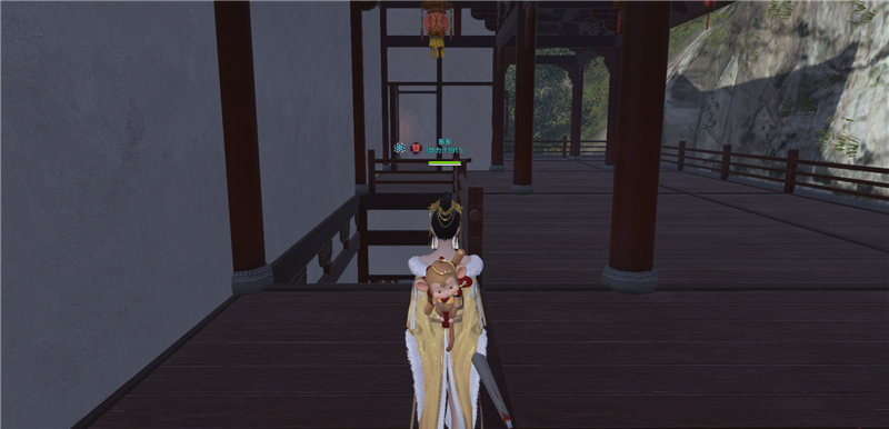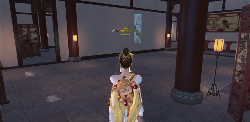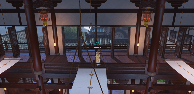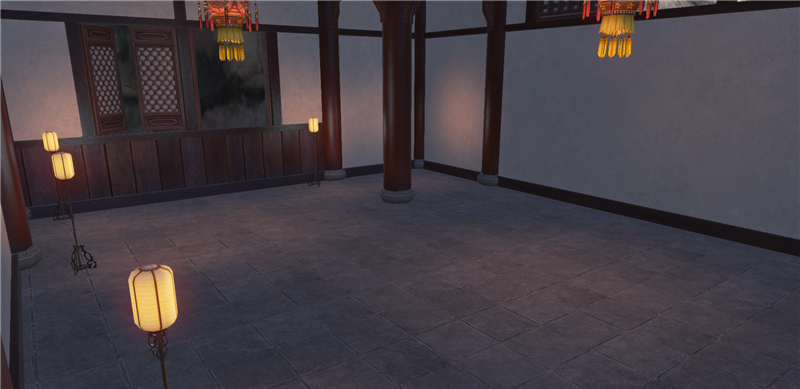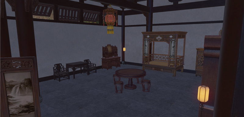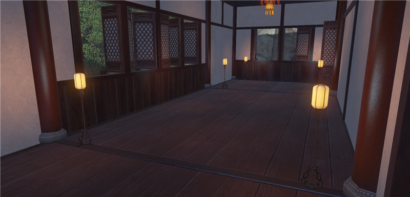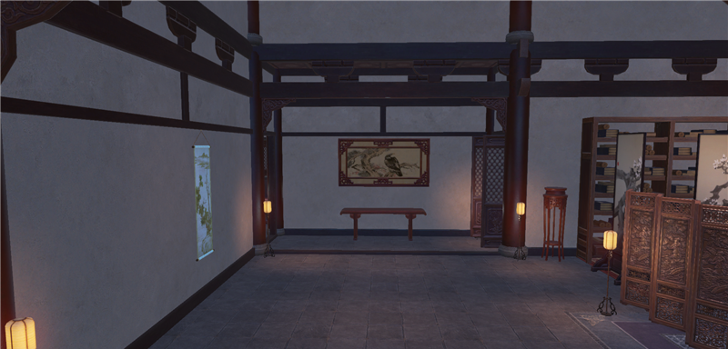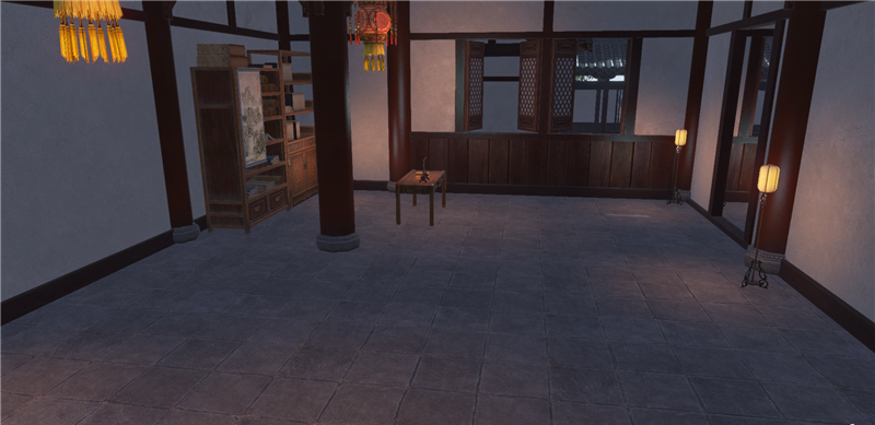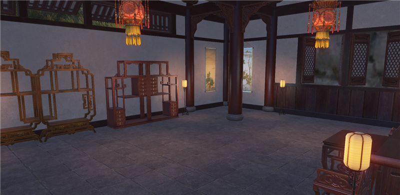进去就是庭院,左边类似一池春景的池子,右边类似NPC图纸的庭院。还好,不算太违和。
