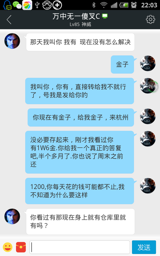 首先怪我自己傻,我承认,轻喷。这个Cherie 之前交易过几次,功力排行前三,一开始感觉还不错。18号开始一直找我想买金,我家里有事不能上游戏。25号回家上游戏,在我这拿走了1W8金,谈好1200块,第二天给钱。