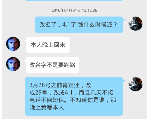 4月1号,改名了,从Cherie改成了 万中无一傻叉C ,问了一下说是本人晚上回来,改名字不是跑路。然后所谓晚上回来的本人又消失了。拖到4月6号,我感觉是骗子的时候又回复了“本人出事了,本人回来肯定还钱。”